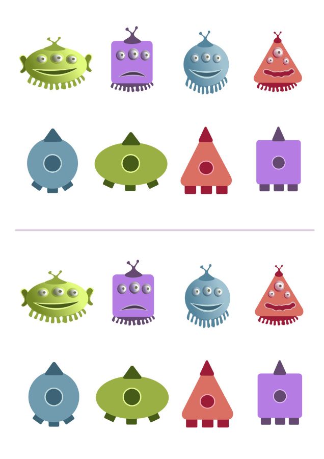 - На какую геометрическую фигуру похож этот пришелец? Он похож на круг (овал и т.д.) Значит он прилетел на круглой (овальной и т.д.) ракете. Найдите для каждого пришельца подходящую ракету.