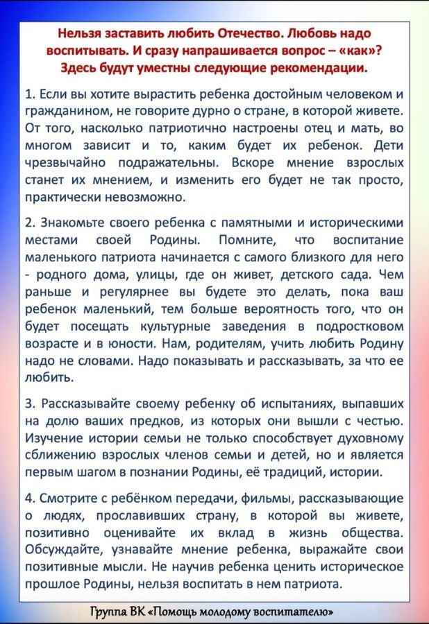 Консультация для родителей "Как воспитать маленького патриота". Источник: Группа ВК Помощь молодому воспитателю.